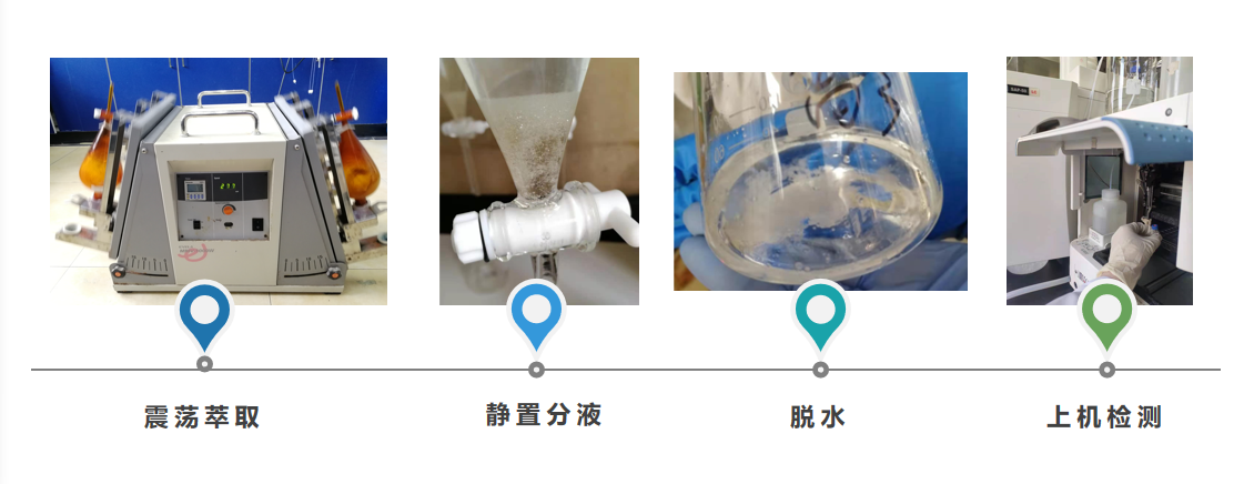 取1 L水样置于1 L分液漏斗中,加入10 g氯化钠,用40 mL二氯甲烷萃取,振摇10 min,静置10 min,收集萃取液于锥形瓶中,然后再用50 mL二氯甲烷萃取(25 mL×2),合并萃取液于三角瓶中,用适量无水硫酸钠进行脱水。将有机相转移至125 mL分液漏斗中,用3 mL反萃取液反萃取5 min,吸取水层溶液,过0.45 µm滤膜后,置于样品瓶中随后上机检测。