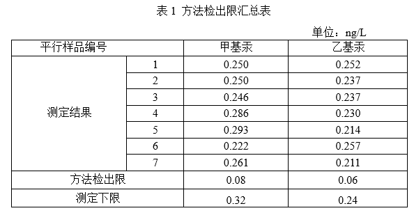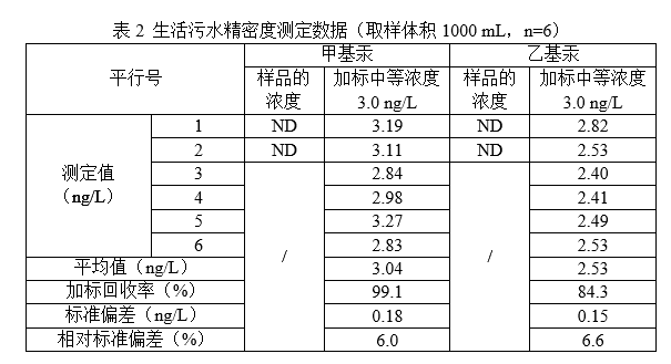 甲基汞的方法检出限为0.08 ng/L,测定下限为0.32 ng/L; 乙基汞的方法检出限范围为0.06 ng/L,测定下限为0.24 ng/L。能够满足地表水环境质量标准(GB 3838-2002)以及生活饮用水卫生标准(GB 5749-2006)的标准限值。对加标浓度为3.00 ng/L 的生活污水样品进行重复性测定,重复性均可达到《水质烷基汞的测定 液相色谱-原子荧光法》的重复性要求。