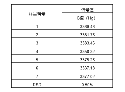 连续进7次1.0μg/L标准溶液1mL,重复性统计见表4。