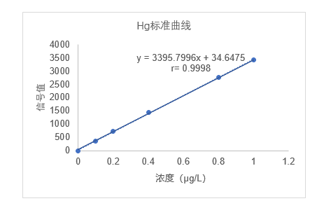 将系列汞标准溶液(0.1μg/L、0.2μg/L、0.4μg/L、0.8μg/L、1.0μg/L)依次进样1mL,以元素浓度为横坐标,信号值为纵坐标绘制标准曲线,汞的线性见图1,线性及相关系数见表5。