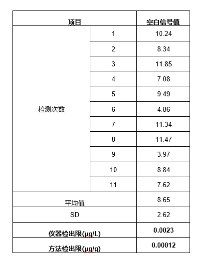 对空白溶液进行11次荧光强度的测量,计算仪器检出限为0.0023μg/L,取样量为0.5g时,方法检出限为0.00012μg/g,检出限详情如表6。