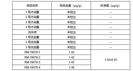 选取4种沐浴露、1种洗手液和3种洗发露共8种样品及以沐浴露为基体的标准物质(化妆品中铅、镉、汞和总活性物标准物质(RM-19078))采用以上方法进行测试,详细测定结果见表7。