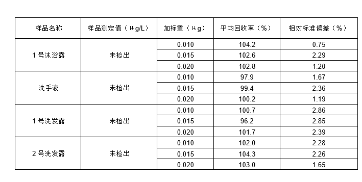 对1号沐浴露、洗手液、1号洗发露和2号洗发露4种样品分别采用低、中、高三种不同浓度水平的加标,分别对每个加标样品平行测定6次,加标回收率为96.2%~104.3%,相对标准偏差为0.75%~2.86%。样品加标回收率详见表8。