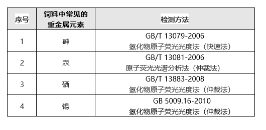 防止重金属元素在饲料中的滥用,根据 GB 13078-2017 《饲料卫生标准》、GB 26418-2010 《饲料中硒的允许量》、GB 26434-2010 《饲料中锡的允许量》等对一些常见的重金属元素添加剂量和试验方法进行了明确的规定。