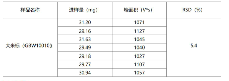 用大米标(GBW10010)建立标准曲线,用天平称量系列质量的标物,使用石墨舟进样,标准系列的进样量可在 4mg~40mg 之间,大约为 5mg、11mg、18mg、25mg 和 35mg。